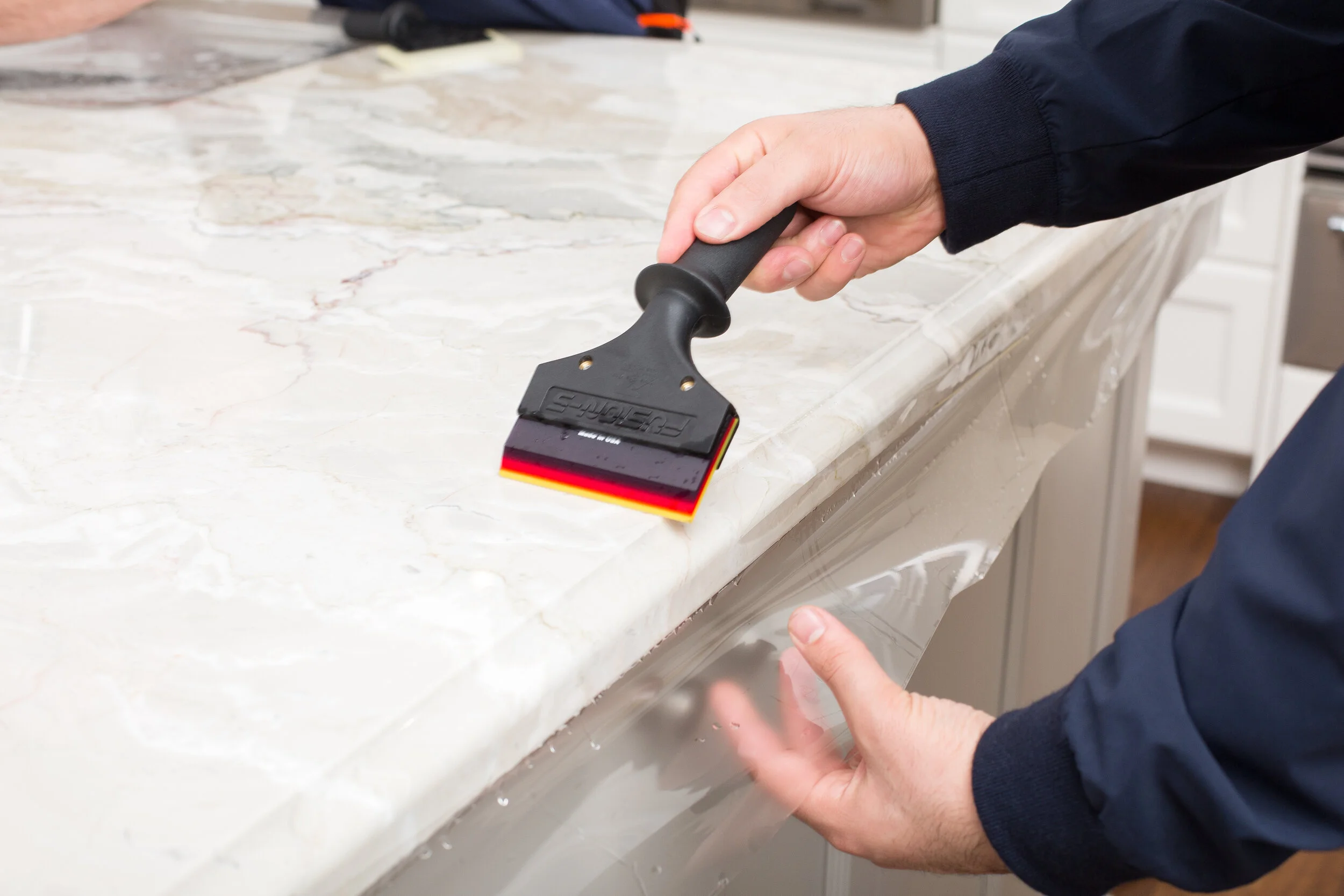A: I had tried resealing [the countertops], but that didn't really do anything at all. I was more confident when I saw the film go down, you could actually see the watermarks disappearing. It was unbelievable. Then I was more confident [the coating] was going to work.